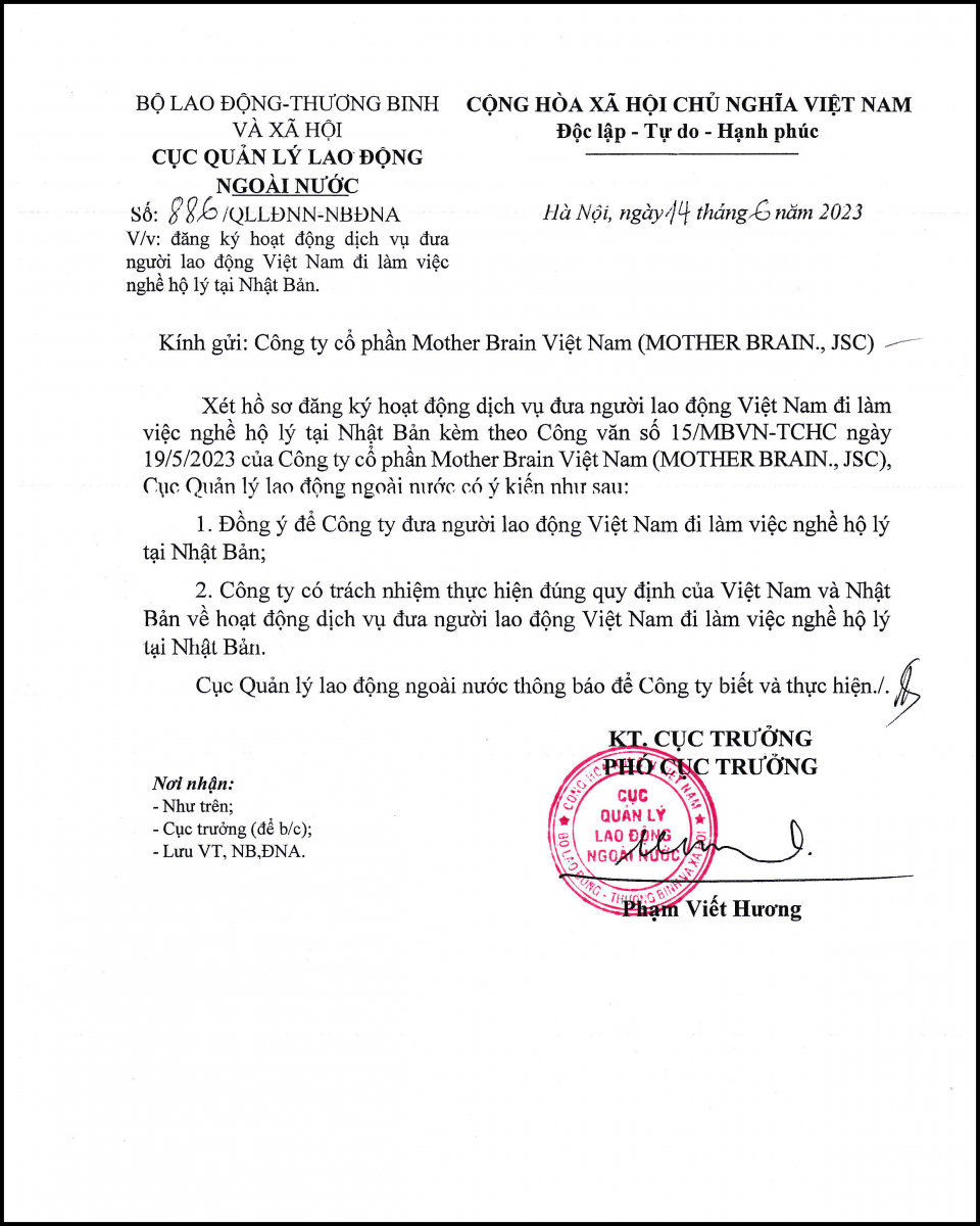 Thực hiện giấy phép số 886/QLLĐNN-NBĐNA cấp ngày 14/06/2023, Công ty cổ phần Mother Brain Việt Nam hoạt động theo tiêu chí: "Chất lượng làm nên thương hiệu". Chúng tôi cam kết mang đến cơ hội việc làm ổn định, góp phần nâng cao thu nhập, cải thiện chất lượng cuộc sống cho người lao động. Với đội ngũ nhân viên giàu kinh nghiệm và cơ sở vật chất được trang bị đầy đủ, chúng tôi đã và đang khẳng định được vị thế của mình trong lĩnh vực đưa người lao động đi làm việc nghề hộ lý tại Nhật Bản. Chúng tôi sẽ luôn luôn làm việc hết mình với trách nhiệm cao nhất có thể, nhằm mang đến niềm tin và sự an tâm tuyệt đối cho người lao động.